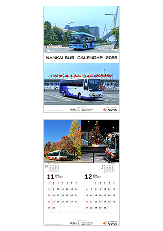 B3縦サイズの壁かけタイプ7枚綴りカレンダーです。当社のほかグループ企業の南海ウイングバス・関西空港交通を含めた様々なバスの写真を、季節の風景と折り合わせました。